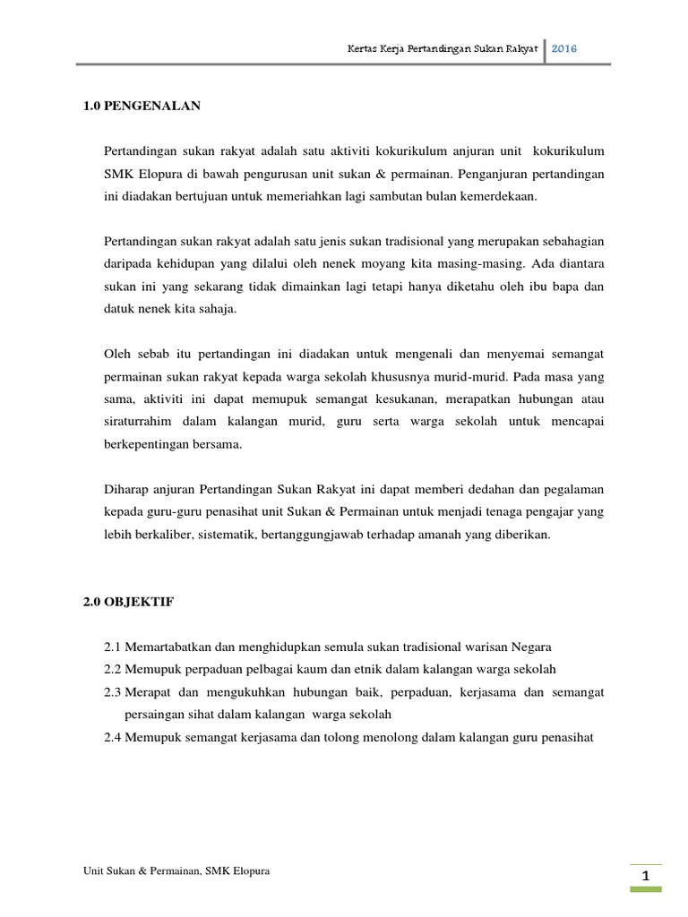 Contoh kertas kerja sukan sekolah. Jawatankuasa kemajuan keselamatan kampung persekutuan jkkkp kg selayang indah anjuran bersama. Hari sukan negara ini adalah penting di dalam usaha kerajaan menggalakkan rakyat menerapkan amalan budaya hidup cergas dan aktif.