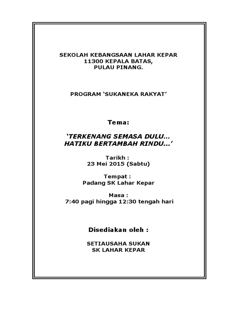 33 Full PDFs related to this paper. 10 tajuk kertas kerja karnival sukan tahnan sekolah kebangsaan air merah kedah. 19 disember 2010 ahad masa.