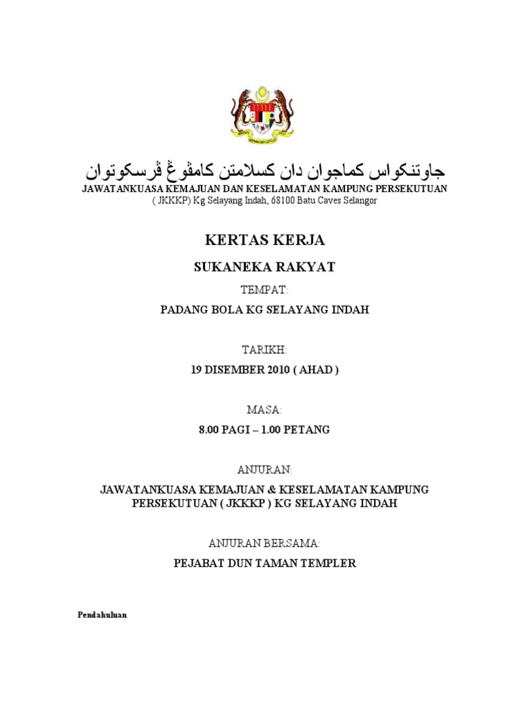 Kertas kerja penganjuran karnival sukan rakyat 2011peringkat felda bukit rokan utarapengenalanpihak felda melalui pengurus encik abdul jalal ajat telah meminta kerjasama pihak jkkkuntuk menganjurkan satu. Padang bola kg selayang indah tarikh. 800 pagi 1200 tengah malam lokasi.